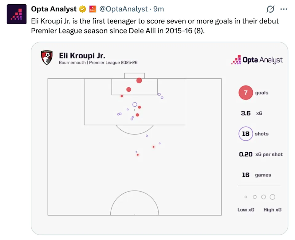 Ele tambĂ©m Ă© o primeiro adolescente a atingir esse nĂșmero em uma temporada de estreia na Premier League desde que Dele Alli marcou oito gols na temporada 2015/16.