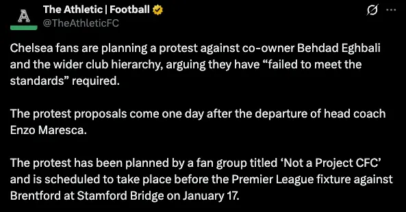 O protesto planejado é liderado por um grupo intitulado ‘Not a Project CFC’ e está programado para acontecer em 17 de janeiro, antes do derby dos Blues com Brentford em Stamford Bridge.