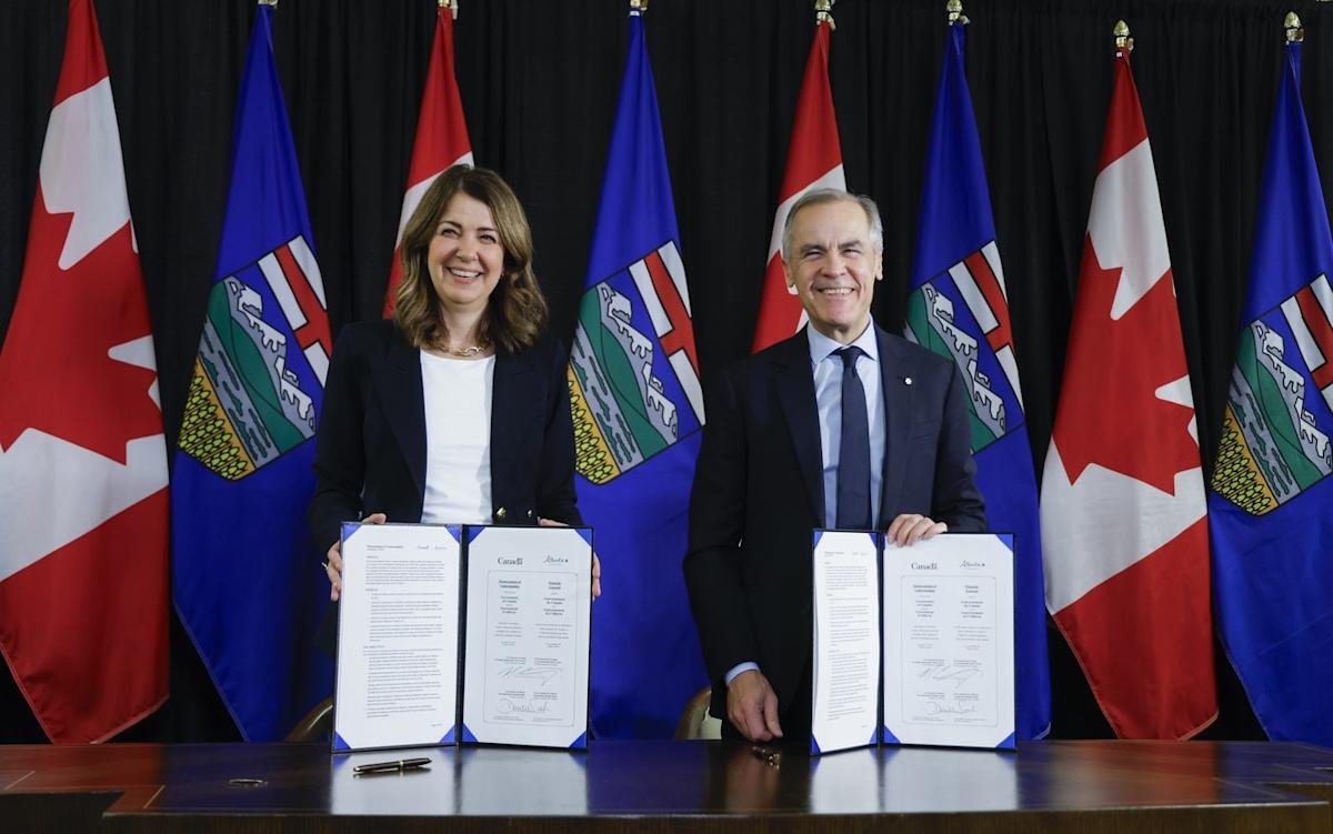 Carney e a primeira-ministra de Alberta, Danielle Smith, assinaram um memorando de entendimento em novembro passado sobre uma ampla gama de questões energéticas. Incluía um caminho para considerar um novo oleoduto de areias petrolíferas para a Costa Oeste elegível para uma revisão simplificada.