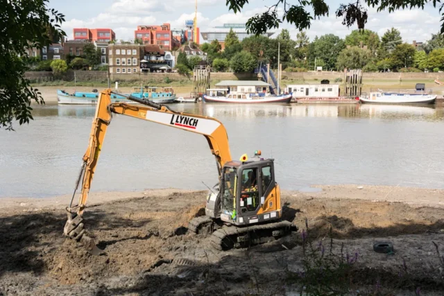 Uma escavadeira limpa a ‘Ilha dos lenços umedecidos’ em Londres. (Getty)