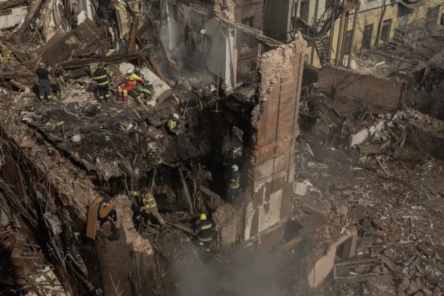 Roman Pilipey/AFP via Getty Images – FOTO: Equipes de resgate ucranianas trabalham no local de edifícios fortemente danificados após um ataque aéreo russo no Dnipro, em 16 de abril de 2026, em meio à invasão russa da Ucrânia.