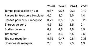 A grande diferença para sua situação fora do jogo de transição, assim como nas saídas e nas entradas da zona. Neste ano, o efeito foi em cerca de 6,9 surtidas de zona por encontro, um croissance importante por relacionamento com as três temporadas anteriores (veja o quadro). Por exemplo, a última temporada foi efetivada em meados de 4,8. Quanto aux entrées en zona adversa, il en effectue en moyenne 4,5 par partie alors qu’il se situait a 3 l’année dernière.