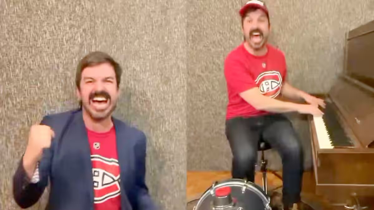 Em seu estilo bem à sua maneira, que se desenvolveu durante a pandemia de COVID-19, Damien Robitaille publicou em suas redes sociais uma versão de uma orquestra masculina acompanhada de três coristas (ele é disfarçado em três partidários de CH vêtus de um chandail rouge de l’équipe).