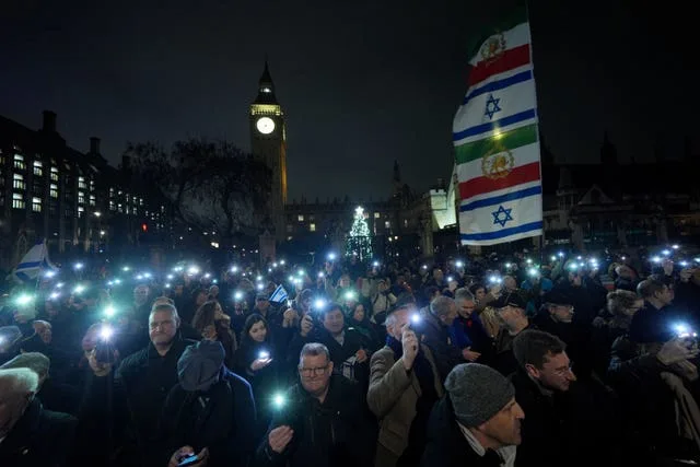 Pessoas participam de um evento da Campanha Contra o Antissemitismo e Chabad no Reino Unido em Westminster na noite de terça-feira (Yui Mok/PA)
