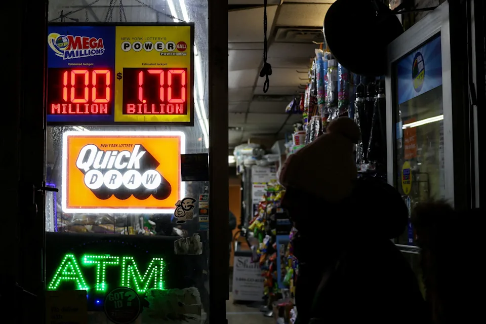 Uma pessoa passa por uma placa eletrônica que exibe o jackpot de US$ 1,7 bilhão no sorteio da loteria Powerball na cidade de Nova York, EUA, em 23 de dezembro de 2025.