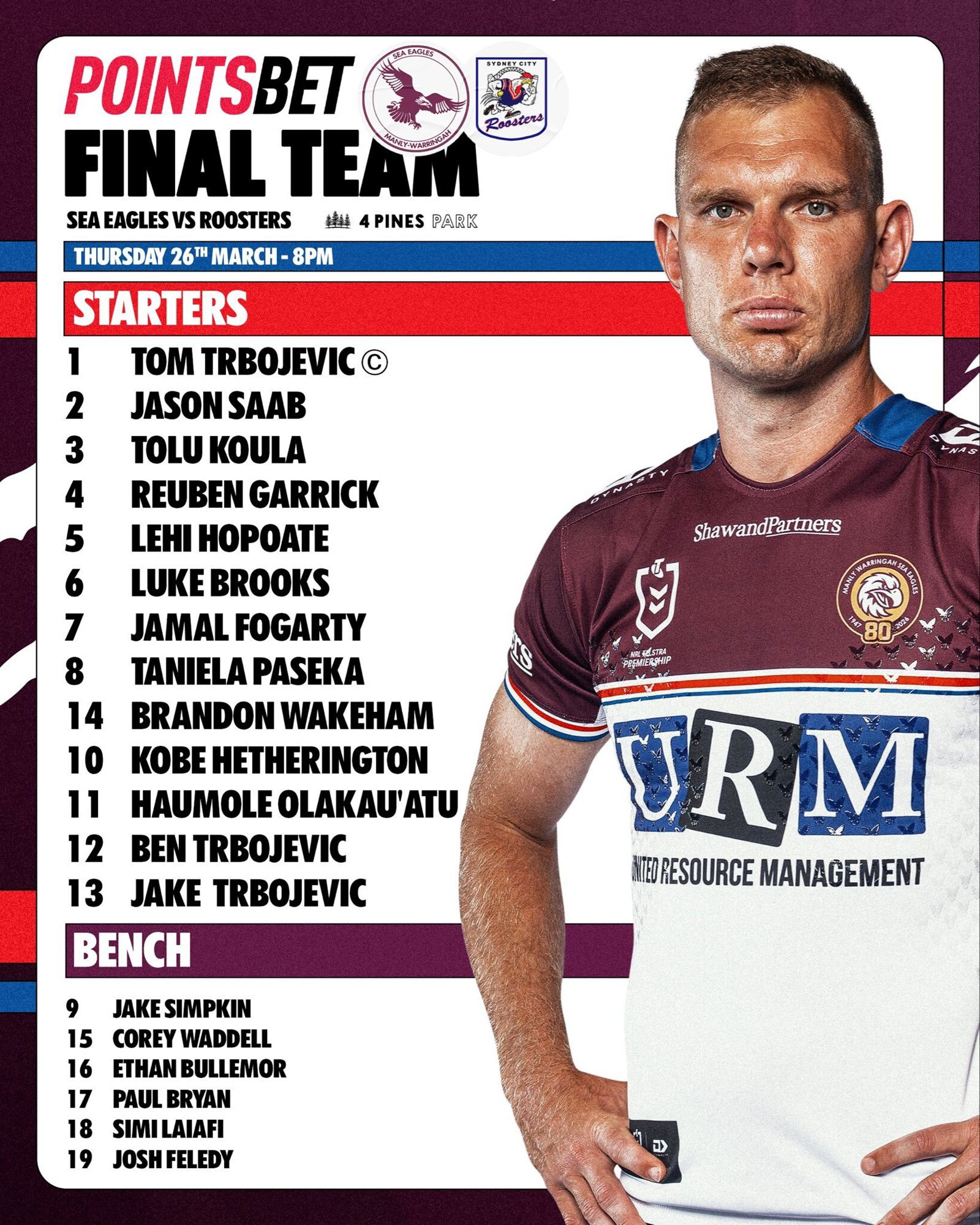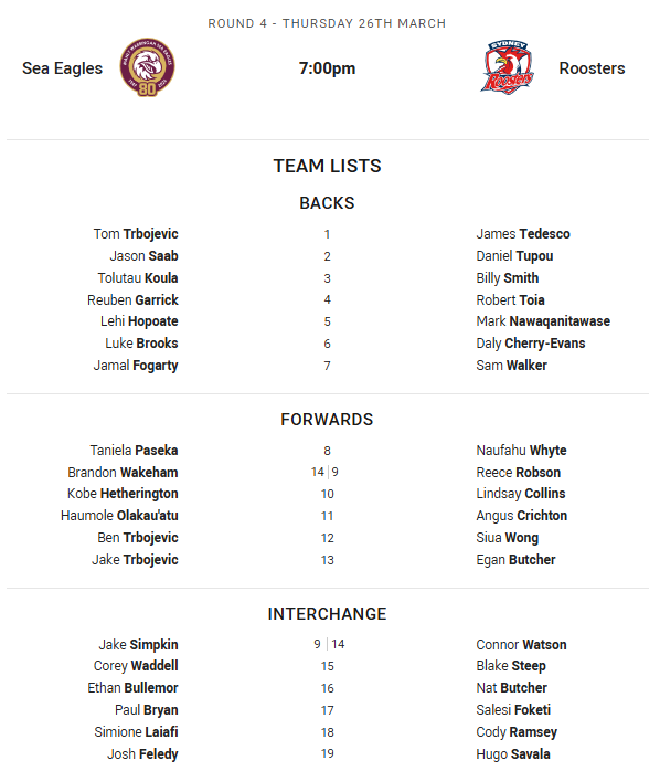 Olá fãs do NRL e bem-vindos a uma partida que pode dar início a uma rodada de partidas rancorosas na quarta rodada, com o Manly Warringah Sea Eagles recebendo o Sydney Roosters em um Brookvale Oval encharcado e varrido pelo vento nas praias do norte.
