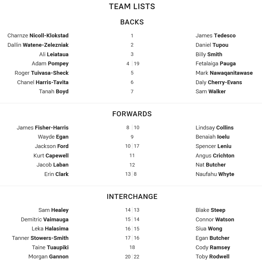Os Warriors, por sua vez, estão 1-18, com o remador inglês Morgan Gannon tendo a chance de sua estreia na NRL fora do banco com a camisa 20