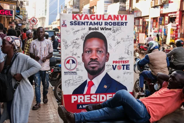 Wine, cujo nome verdadeiro é Kyagulanyi Ssentamu, diz que está escondido atrás do presidente Yoweri Musevenique está no poder desde 1986, foi declarado vencedor das eleições presidenciais de quinta-feira.