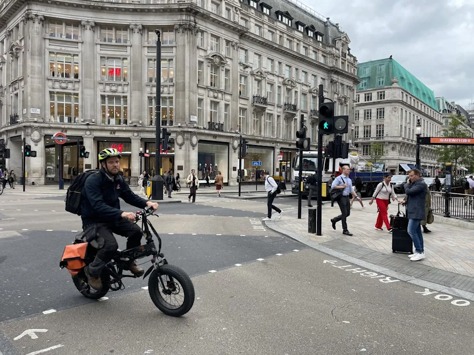 Flagrante: um ciclista de bicicleta elétrica atravessou o cruzamento do ‘homem verde’ na Oxford Street (Ross Lydall)
