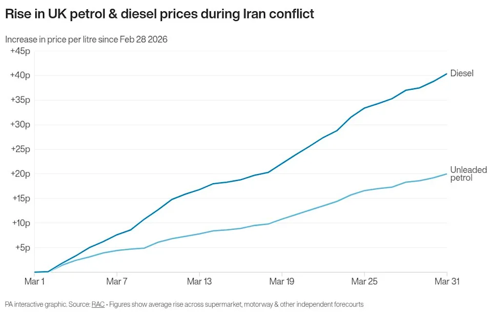 O RAC disse que o preço médio de um litro de diesel nos postos de abastecimento do Reino Unido na quarta-feira era de 184,2p, um aumento de 29% desde o início da guerra em 28 de fevereiro.