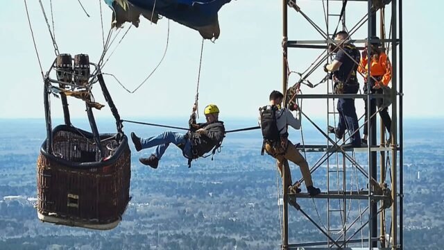 As autoridades divulgaram imagens do resgate, em 28 de fevereiro, de duas pessoas presas dentro de um balão de ar quente a 270 metros de altura, após colidir com uma torre de rádio em Longview, Texas. O que causou a colisão do balão é atualmente desconhecido.