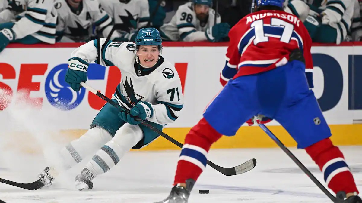 13:12 | MAS – Macklin Celebrini (SJS) reçoit la rondelle no alto do enclave e sert tout un tir para Jakub Dobes (MTL)