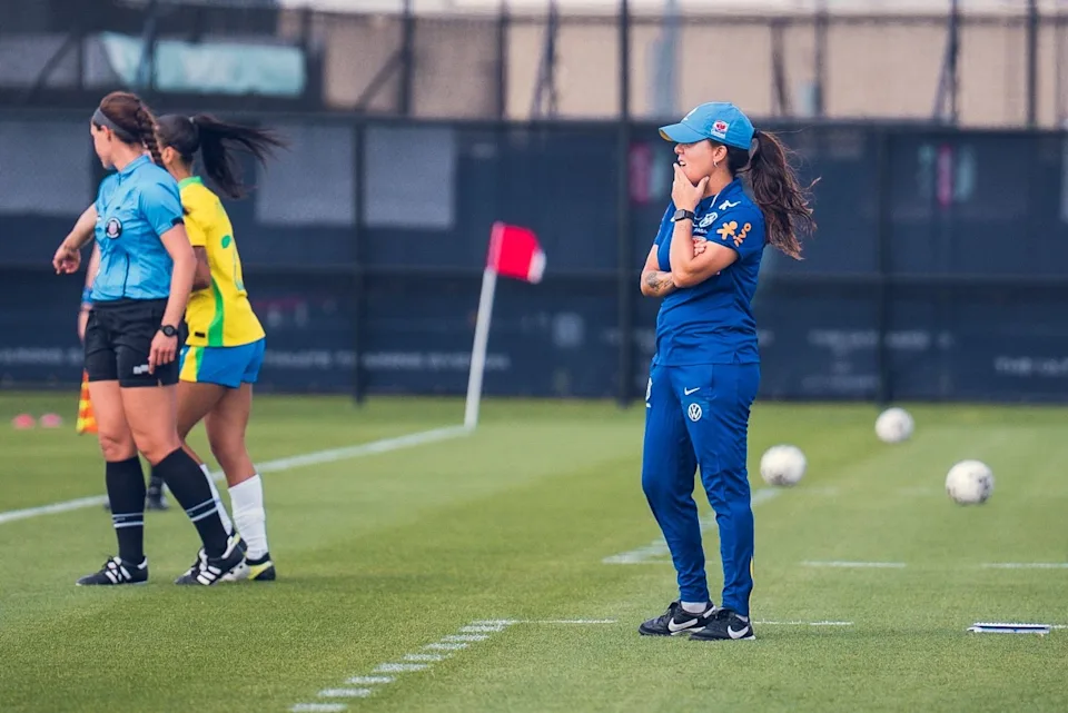 Treinadora Camilla Orlando durante o segundo amistoso contra os EUA, realizado no Riverside StadiumCréditos: Fábio Souza/CBF