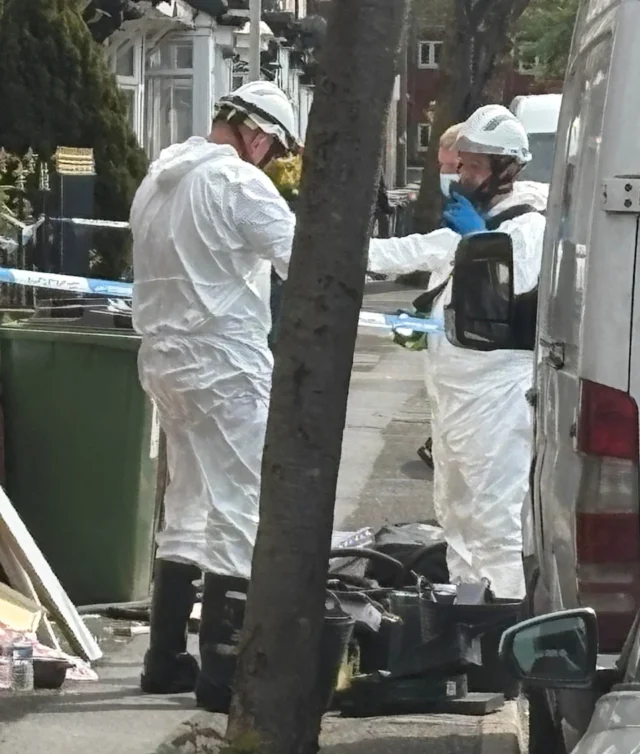 Investigadores usando roupas de proteção foram vistos vasculhando a propriedade no sábado (PA)