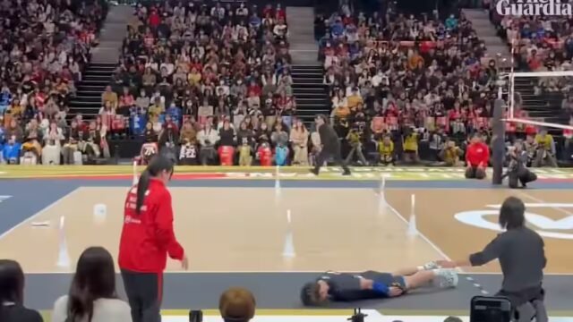 Um jogador de vôlei está dispensado depois de realizar um jogo de linha com bola, no evento All-Star da SV League em Kobe, no oeste do Japão.