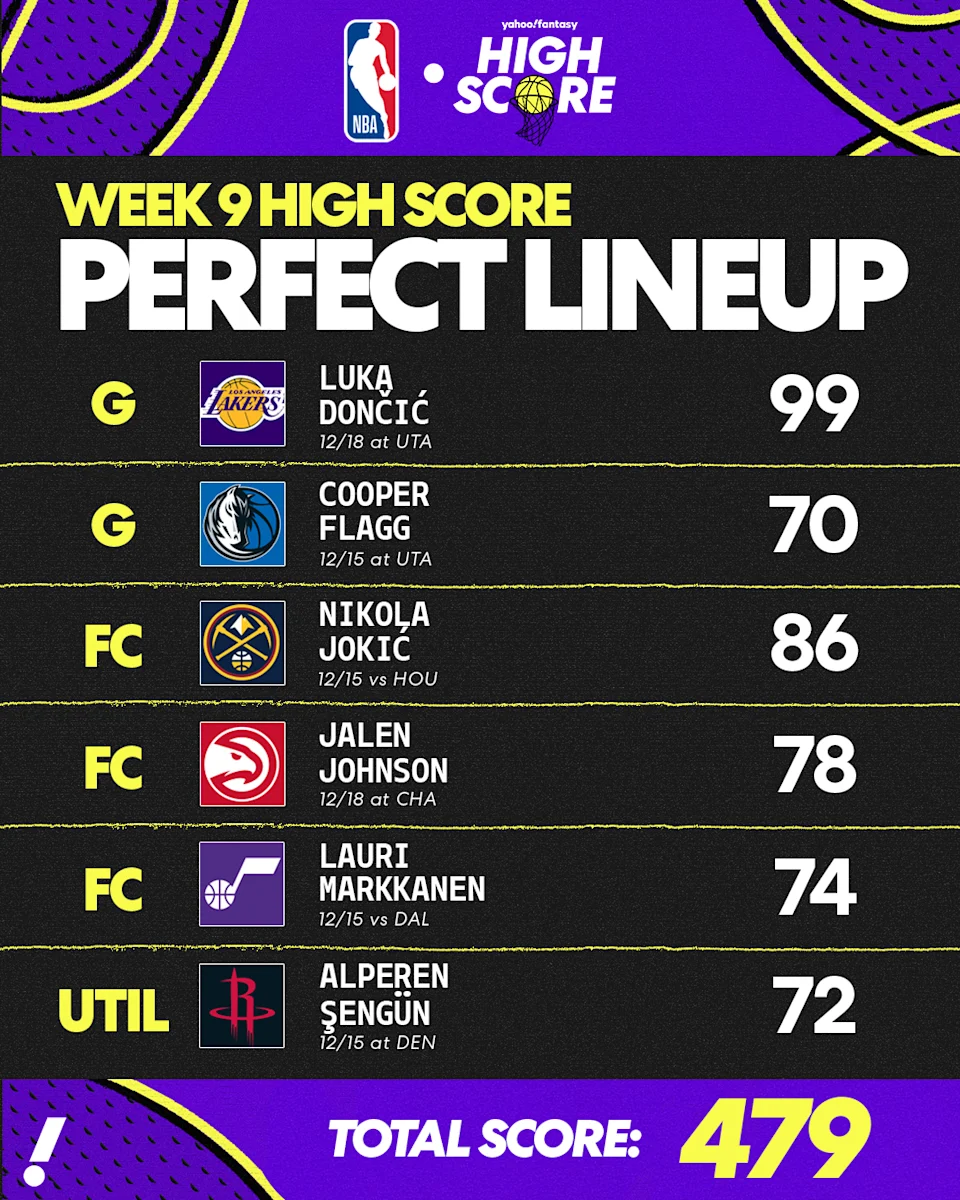 Cooper Flagg, guarda: O fenômeno novato do Mavericks faz sua primeira aparição na escalação perfeita para High Score. Ele começou a mostrar flashes em novembro e sua pontuação realmente apareceu ultimamente. Flagg tem pelo menos 22 pontos em quatro jogos consecutivos, um deles contesta sua explosão de 42 pontos contra Utah no início da Semana 9. Ele se tornou o jogador mais jovem da história da NBA a marcar mais de 40 pontoss, quebrando um recorde de LeBron James. Flagg é atualmente um dos 30 melhores ativos em pontuação alta e só deve melhorar com mais experiência.