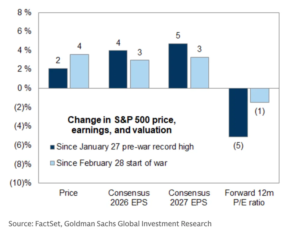 O S&P 500 subiu 12% desde o seu mínimo de 30 de março, empurrando o índice para além dos 7.000 pela primeira vez na semana passada, no meio de esperanças de um fim ao conflito dos EUA com o Irão. Enquanto isso, as estimativas consensuais de ganhos para 2026 e 2027 são de 4% acima Níveis de janeiro, apontou o estrategista do Goldman Sachs Ben Snider