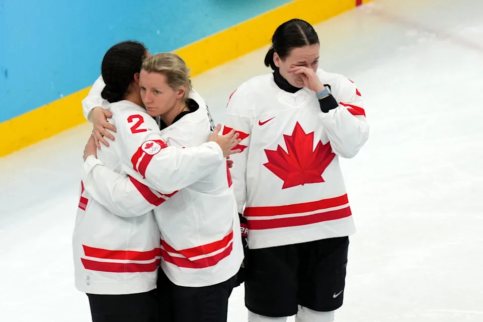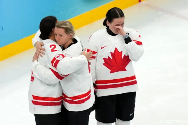 Sophie Jaques, da equipe canadense, abraça Kati Tabin, do centro, de Winnipegger, enquanto aguardam o início da cerimônia de medalhas, depois que os Estados Unidos conquistaram a medalha de ouro no hóquei feminino nos Jogos Olímpicos de Inverno, em fevereiro. (Carolyn Kaster/Associação de Imprensa)