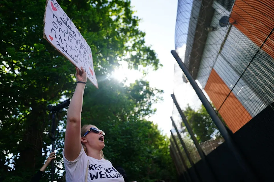 Manifestantes no Centro de Remoção de Imigração Brook House, em Gatwick, protestam contra os planos de enviar migrantes para Ruanda. (PA)
