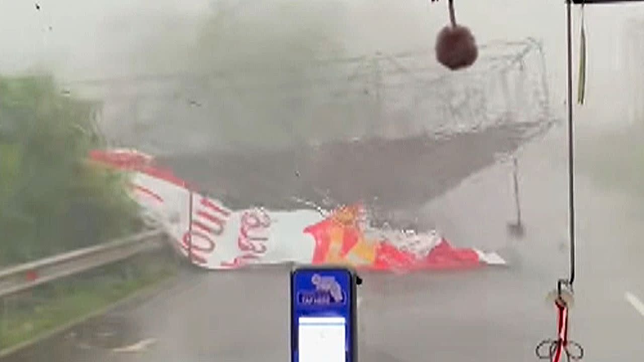 Este é o momento em que ventos fortes e chuvas fortes em Jacarta, na Indonésia, em 12 de abril, derrubaram um outdoor na rodovia Cawang Toll, bem em frente ao tráfego que passava.