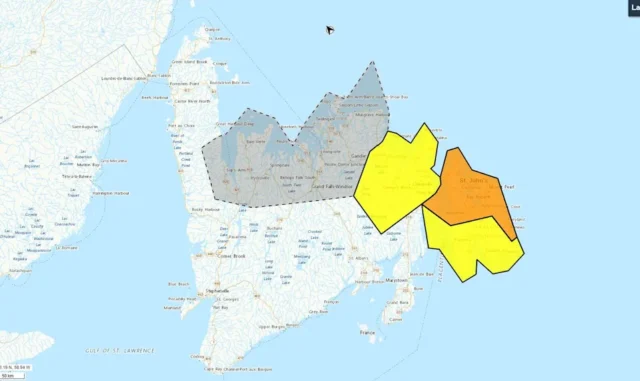 A Environment Canada emitiu um alerta laranja de tempestade de inverno para a área de St. John e o norte da península de Avalon. A previsão é de que caiam entre 25 a 50 centímetros de neve na região, com rajadas de vento de até 80 km/h.