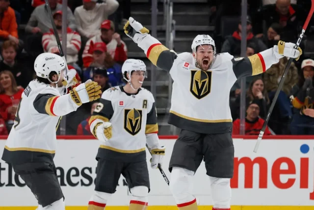 Reilly Smith e Ivan Barbashev marcaram os outros gols por Vegas, o que encerrou uma viagem de cinco jogos. Adin Hill fez 23 defesas no terceiro jogo dos Golden Knights em quatro noites.