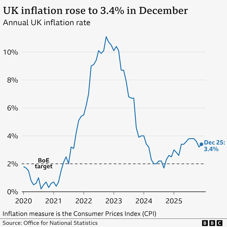 O aumento para 3,4% no ano até Dezembro foi superior ao esperado, com a maioria dos economistas prevendo apenas um ligeiro aumento.