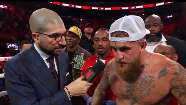 ‘A propósito, acho que meu maxilar está quebrado’, disse Paul durante sua entrevista pós-luta antes de fazer uma pausa para cuspir um pouco de sangue.