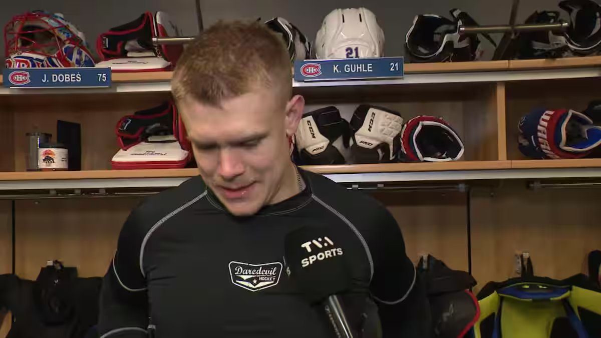 Depois de desistir do patinoire alguns instantes, Guhle está revenu au jeu, usando esta frustração para e dando um golpe sólido no endroit de Artturi Lehkonen na zona defensiva.