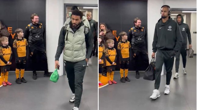 O capitão do clube, Reece James, pode ser visto conduzindo seus jogadores em direção ao vestiário visitante e o internacional inglês, que usa fones de ouvido sem fio, tem uma expressão de firmeza estampada em seu rosto.