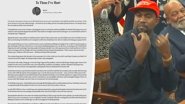 Kanye West, agora conhecido como Ye, publicou um anúncio de página inteira no Wall Street Journal para pedir desculpas às comunidades judaica e negra por seus comentários anti-semitas e comportamento odioso. Publicado em 26 de janeiro, West explica que uma lesão cerebral não diagnosticada levou ao seu transtorno bipolar tipo 1, que o levou a estados de mania.
