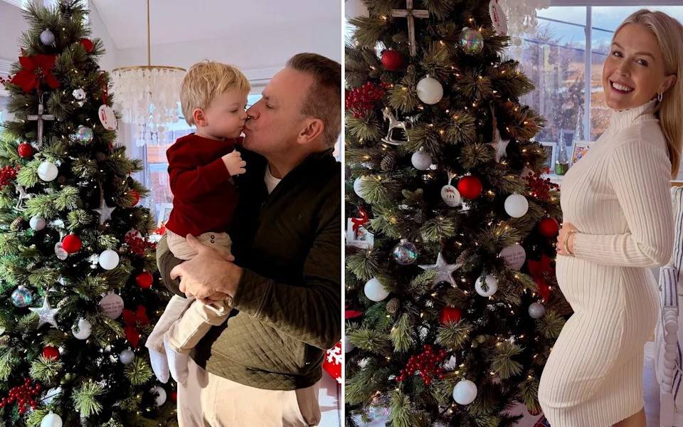 Leavitt, 28, compartilhou uma fotografia sua ao lado de uma árvore de Natal decorada, com as mãos apoiadas na barriga do bebê.