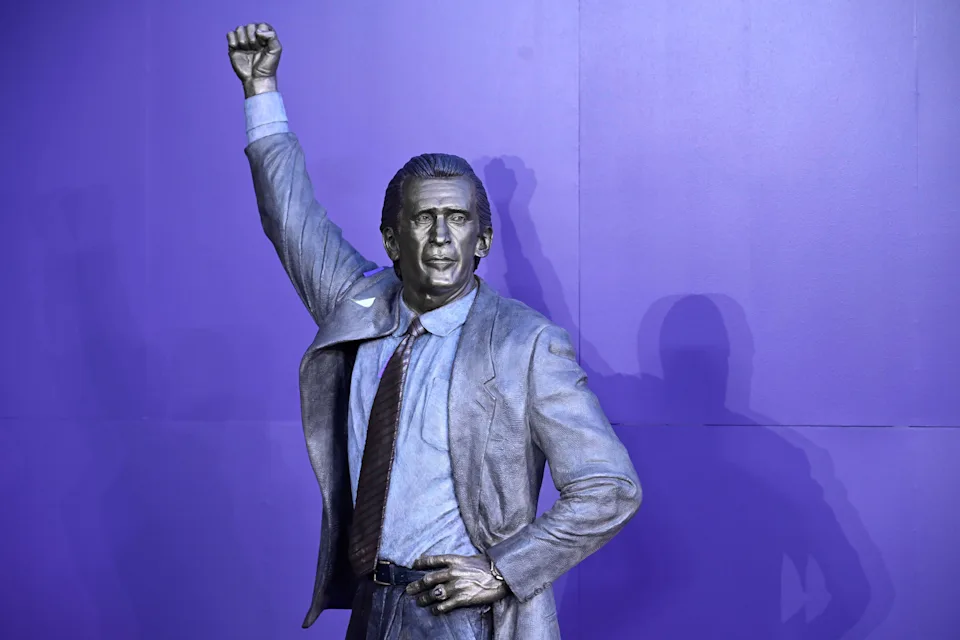 Quando a estátua foi inaugurada, Riley sorriu e levantou o polegar em aparente aprovação.