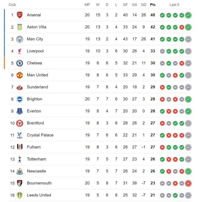 Como está a tabela da Premier League?