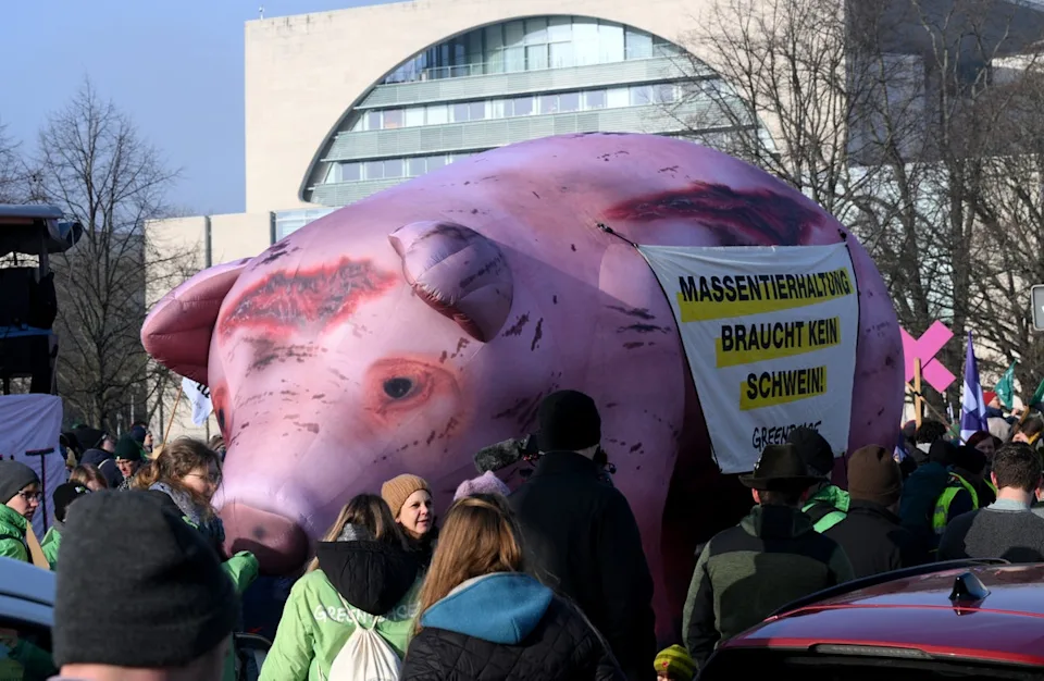 Os manifestantes transportam uma escultura inflada de um porco com a inscrição “Nenhum porco precisa de criação industrial” enquanto participam de uma manifestação intitulada “Estamos fartos!” e exigindo uma transição agrícola socialmente justa, em frente à Chancelaria em Berlim (AFP/Getty)