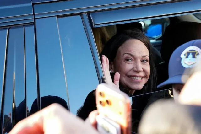 A líder da oposição venezuelana, Maria Corina Machado, acena de um veículo ao deixar o Capitólio dos EUA após uma reunião com senadores dos EUA, após uma reunião anterior com o presidente dos EUA, Donald Trump, na Casa Branca (REUTERS)