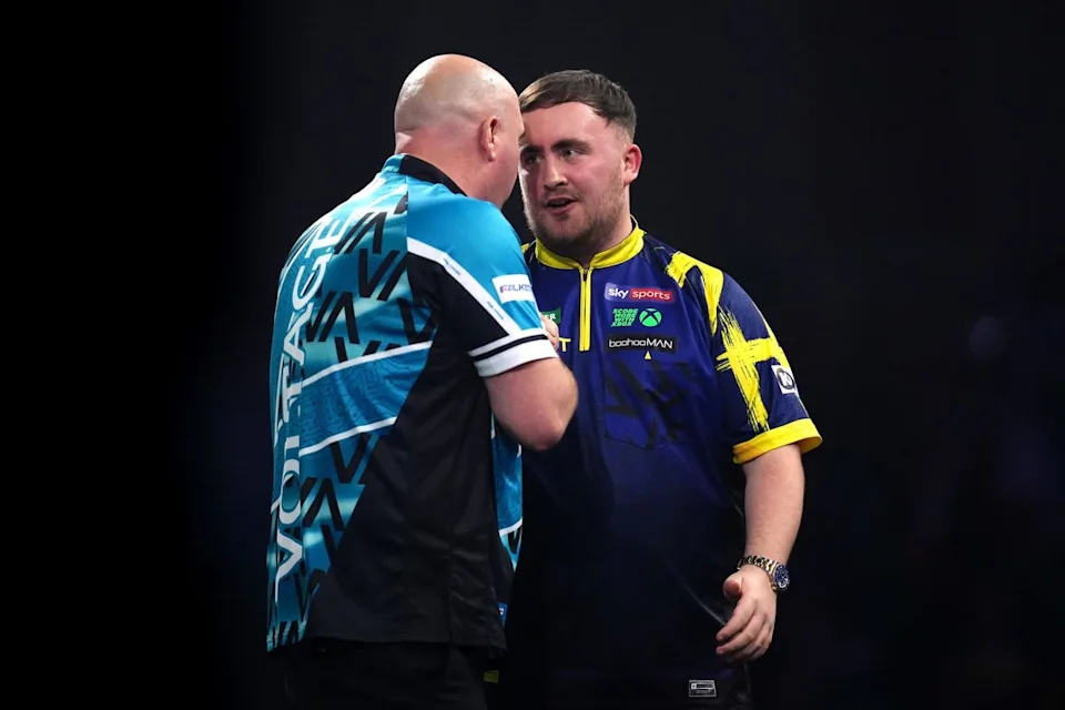 Luke Littler, da Inglaterra (à direita), é entrevistado após derrotar Rob Cross, da Inglaterra (John Walton/PA Wire)
