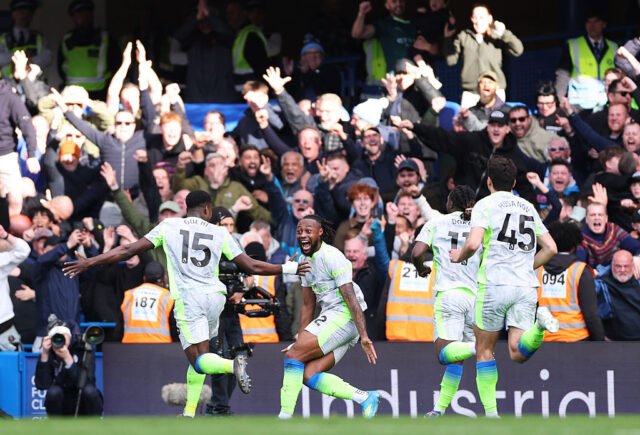 O cruzamento preciso de Rayan Cherki foi cabeceado por O’Reilly para abrir o placar, antes de Cherki marcar outra assistência para o segundo, jogando Marc Guehi para ultrapassar Robert Sanchez.