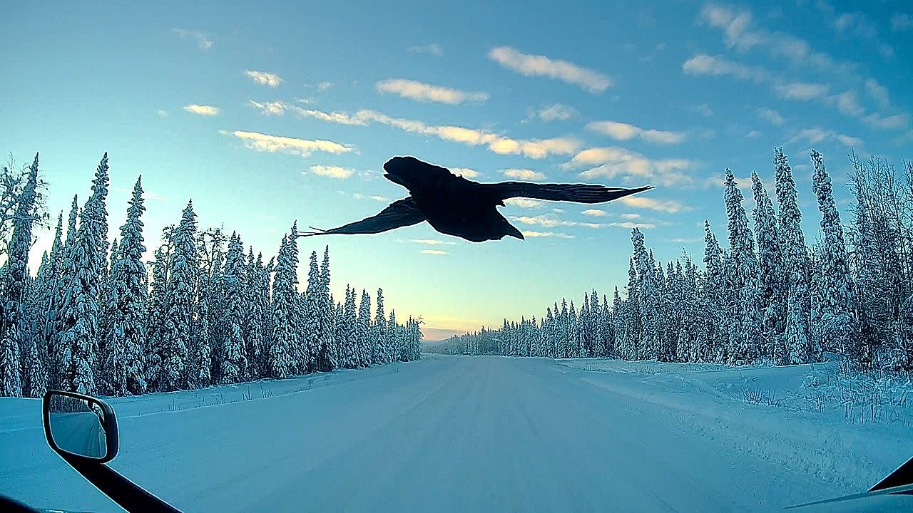 Este é o momento em que um caminhão é escoltado por um corvo enquanto se dirige para uma parada de descanso em Yukon, Canadá, em 12 de dezembro de 2025.