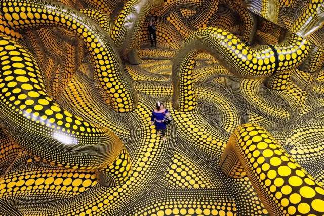 Os trabalhos incluem sua série “My Eternal Soul, 2009-2021”, incluindo uma colcha de retalhos de pinturas, até “O Universo visto da escada para o céu” – feito de espelho, vidro e folha de acrílico. A entrada do museu abriga sua amplamente reconhecida “Abóbora” de 2009, feita de plástico reforçado com fibra e tinta de poliuretano, pertencente ao Museu Voorlinden, na Holanda.