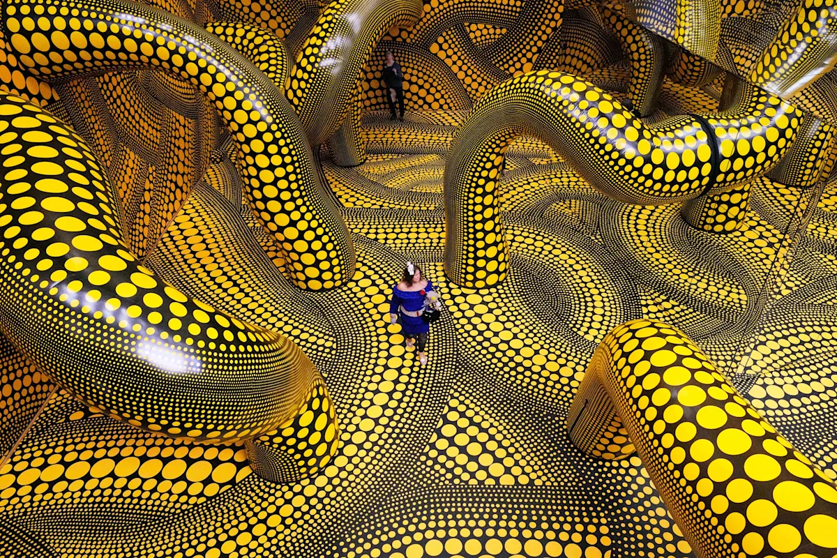 Kusama, que completa 97 anos este mês, se tornou uma sensação nas redes sociais com o uso de cores brilhantes e formas viscosas que refletem seu sentimento de admiração pela vida. Sua própria vida a levou do Japão patriarcal do pós-guerra a Nova York, ao Flower Power e aos movimentos anti-guerra do Vietnã na década de 1960. Ela voltou para casa no Japão em 1973.