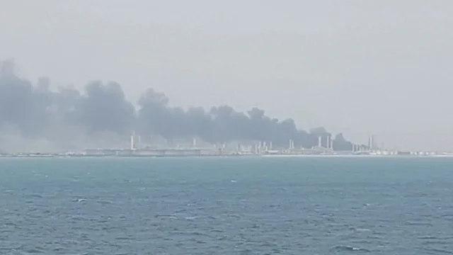 Esta foto enviada por um marinheiro parece mostrar uma refinaria de petróleo iraniana em chamas [Sailor provided to BBC News]