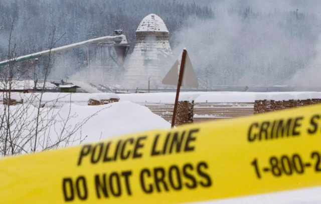 A fumaça sobe enquanto a fita policial cerca a fábrica Babine Forest Products em Burns Lake, BC, em 21 de janeiro de 2012. Duas pessoas morreram em uma explosão lá. (Jonathan Hayward/A Imprensa Canadense)
