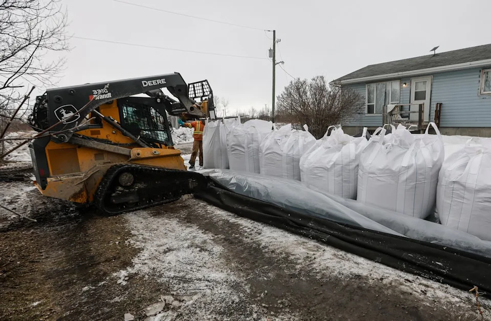 Grandes sacos de areia são colocados ao redor da casa dos Peguis em 16 de abril. (John Woods/The Canadian Press)