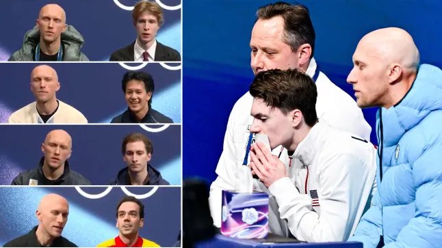 Crédito obrigatório: Foto de Raniero Corbelletti/AFLO/Shutterstock (16538560ln) Maxim NAUMOV (EUA), no Kiss & Cry, com seus treinadores RICHAUD Benoit e PETRENKO Vladimir, durante o Men Single Skating Short Program, nos Jogos Olímpicos de Inverno Milano Cortina 2026, na Milano Ice Skating Arena em Milão, Itália. Jogos Olímpicos de Inverno de Milão Cortina 2026, Milão, Itália - 10 de fevereiro de 2026