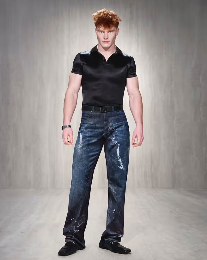 Gavin Weiss, que joga no Calgary Dinos, sua cidade natal, desfilou em Milão vestindo o que parecia ser uma camisa preta justa de colarinho, jeans brilhantes e sapatos e cinto de couro preto.