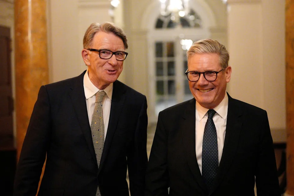 O primeiro-ministro Sir Keir Starmer (R) e o então embaixador britânico nos Estados Unidos Peter Mandelson durante uma recepção de boas-vindas na residência do embaixador em Washington (Carl Court/PA) (Arquivo PA)