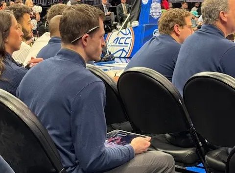 O diretor de análise da Virgínia, Matt Hart, desempenha um papel fundamental durante os jogos, tomando a decisão de desafiar as chamadas. (Dan Wolken/Yahoo Sports)