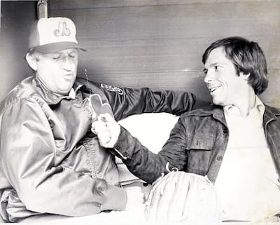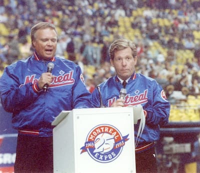 Nesta foto, no voit Rodger e Dan Van Horne, que contém o descritor anglófono das partidas da Expos, no micro antes de uma partida no Stade olympique, na estreia da temporada de 1993.