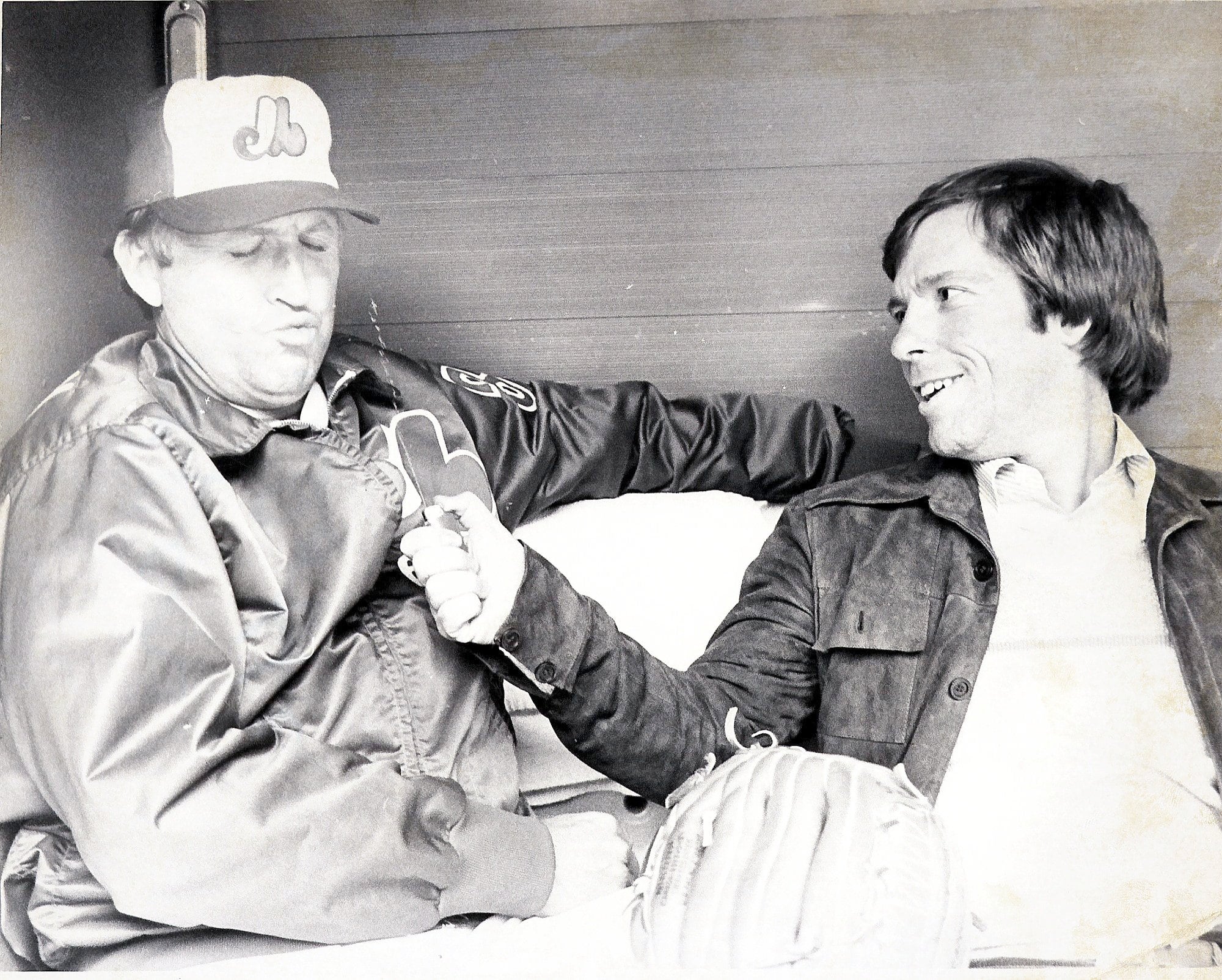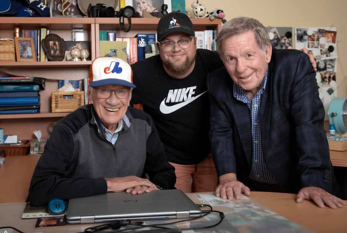 Rodger Brulotte, da companhia do filho acólito de todos os tempos, Jacques Doucet, que foi o descritor das partidas das Expos na rádio e na televisão, de 1972 a 2004. Les deux hommes, qui ont travaillé conjunto durante os últimos anos, foram reunidos no domicílio de M. Doucet em setembro 2024 para um entrevue com Jean-Nicolas Blanchet (no centro), chroniqueur au Jornal. Esta é a última entrevista acordada neste dia por Jacques Doucet. « On était como un couple, avait lance M. Doucet. Isso é um prazer para o trabalho com Rodger. […] Eu sempre pensei que quando você trabalha em equipe, quando você faz uma chamada, é a equipe que está usando. E se um pé for a gueule, les deux on se pétait a gueule. »